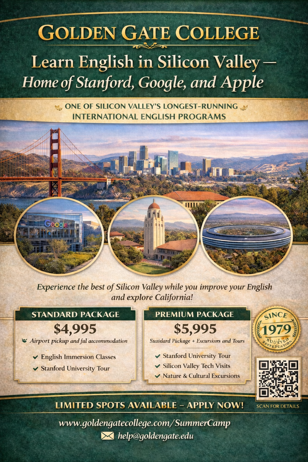 Golden Gate College was established in 1979, one of the longest running international English program. We invite students from around the world to join our Summer English Camp in Silicon Valley, California. This immersive program combines English learning, cultural exploration, and exciting activities in one of the world’s most innovative regions.